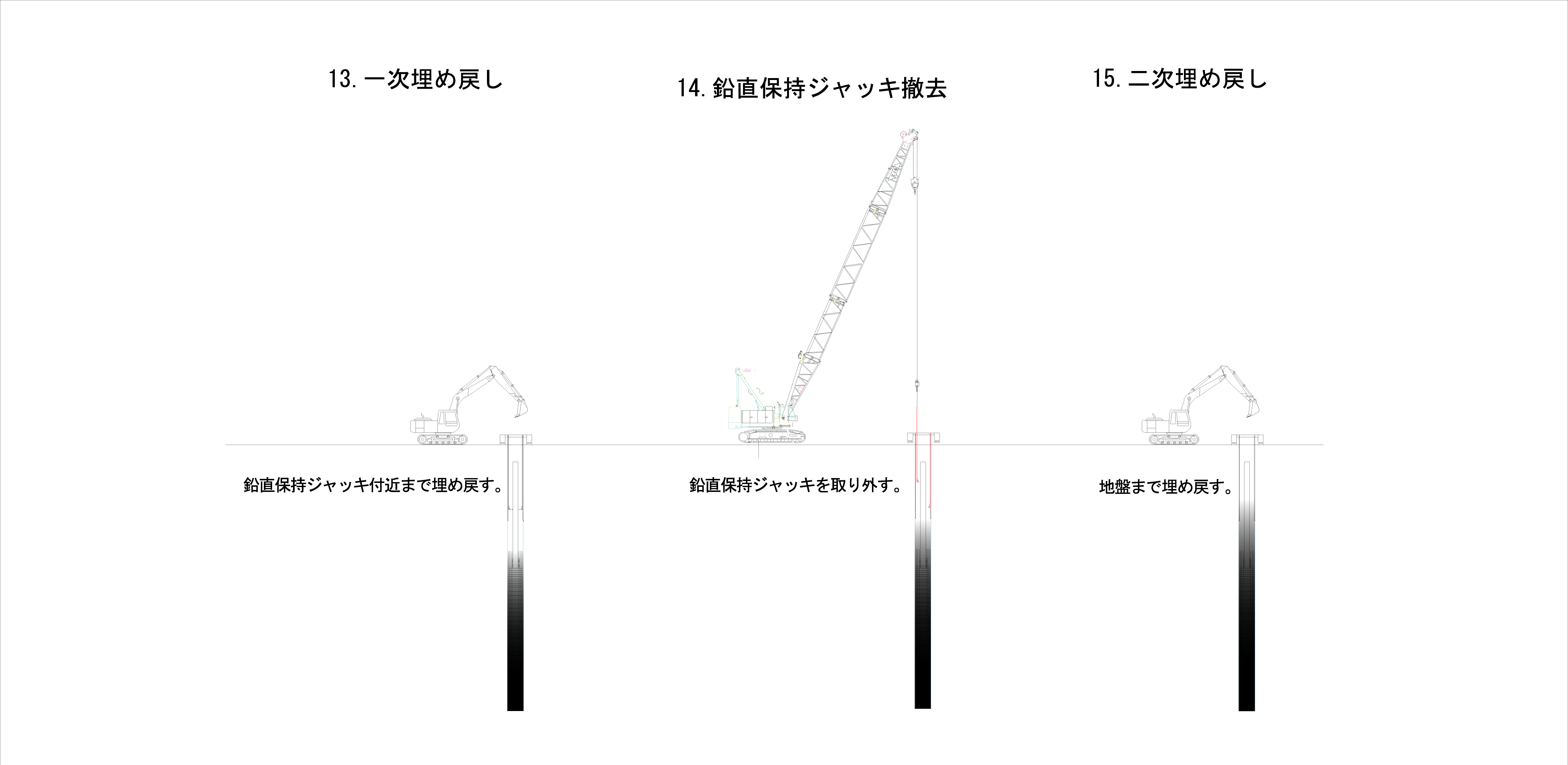 全旋回掘削機を用いるので、杭芯ずれが少なく、さらに鉛直保持用油圧ジャッキ等を用いるので鉛直性にも優れています、