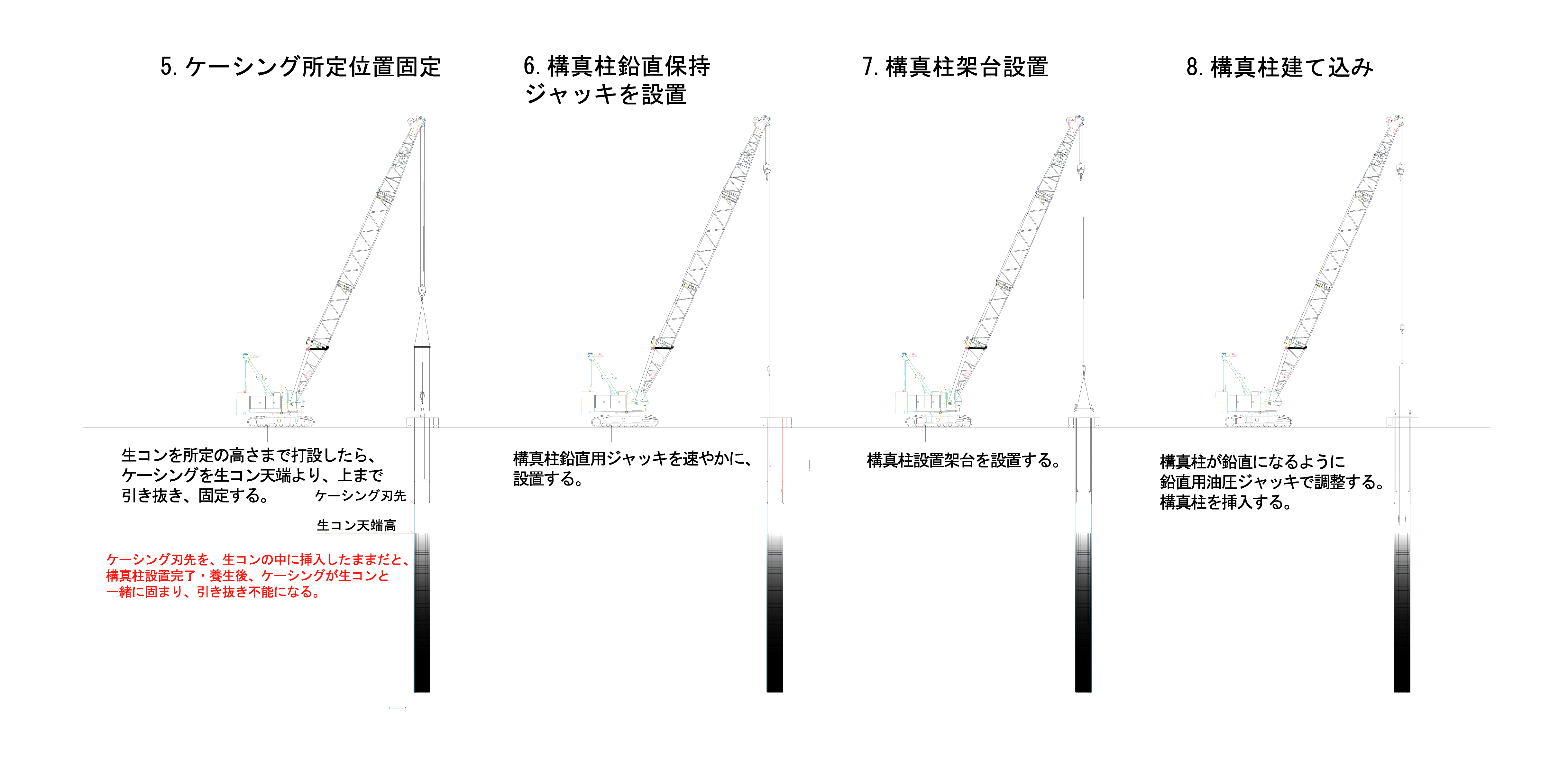 従って精度の高い構真柱を作成することができ、逆打工法や工期が少ない工事には最適です。